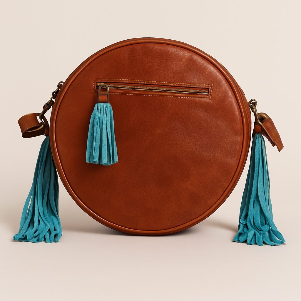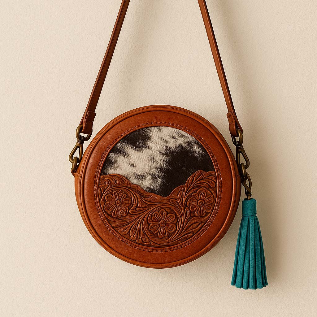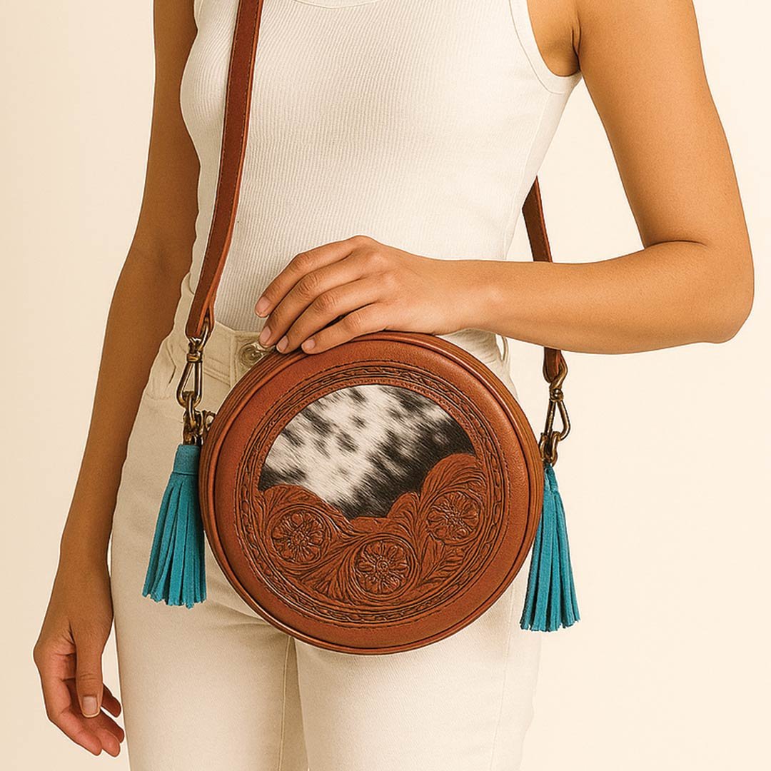 A vintage-inspired round cowhide leather bag featuring hand-carved floral patterns, turquoise tassels, and premium brass hardware. Stylish, durable, and versatile for everyday use.