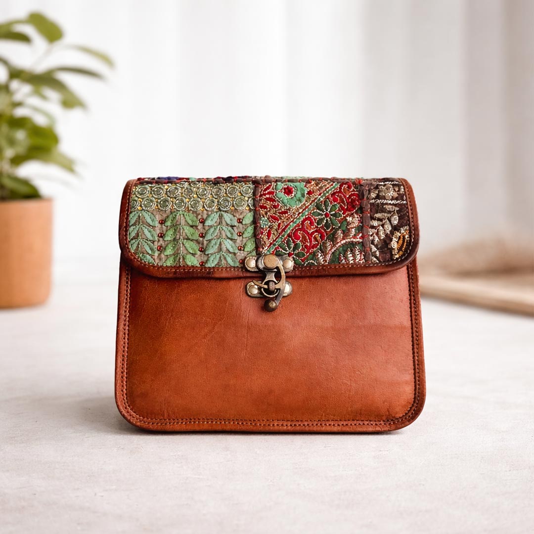 The Zardozi Sling Bag blends premium leather with intricate handcrafted embroidery, creating a stylish crossbody bag inspired by traditional Indian craftsmanship.